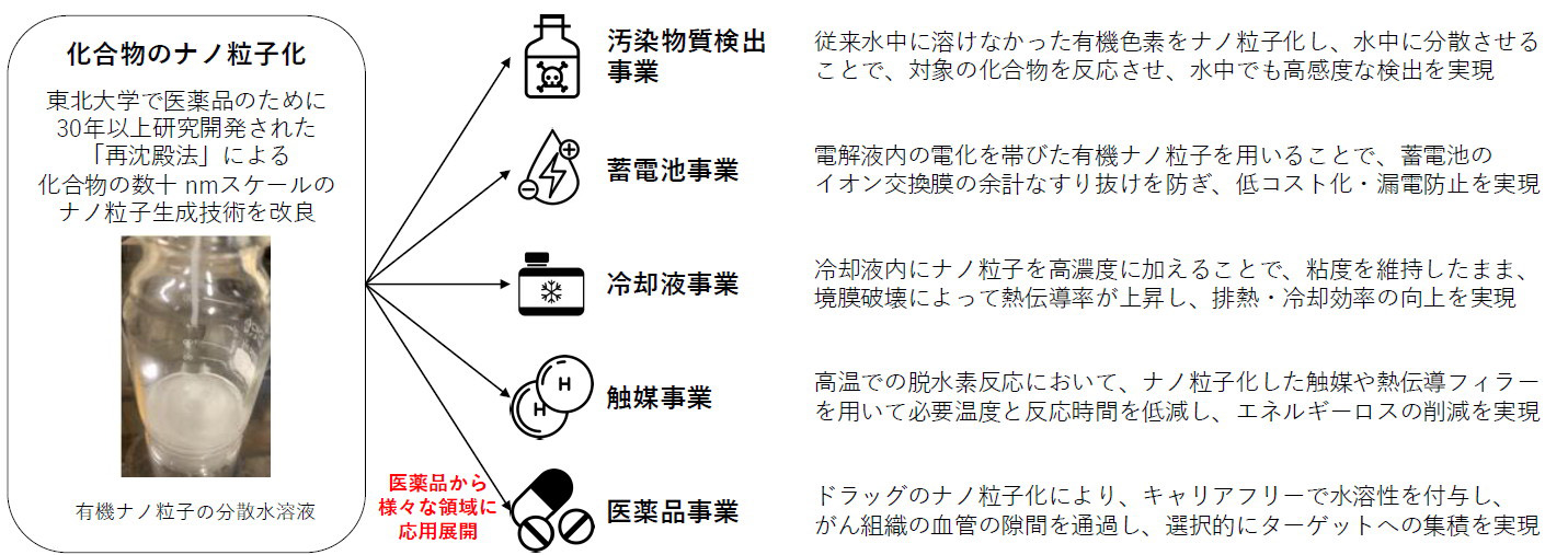 再沈殿法は、東北大学で30年前から医薬品を作るために薬物をナノ粒子化する技術として研究開発されてきた。水に溶けずに凝集・沈殿する薬物を、ナノ粒子として水中に分散させる技術で、医薬品の体内への摂取を容易にすることができる。