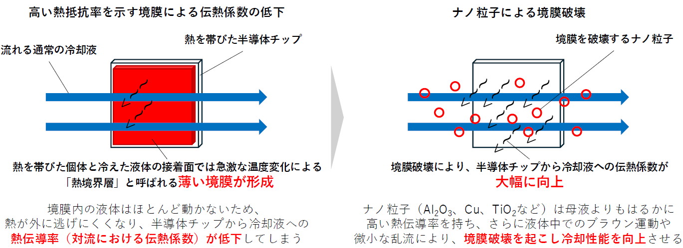 図3に、ナノ粒子を含んだ冷却液による冷却効率向上の原理を示した。図3左は通常の冷却液が熱を帯びた半導体チップ上を流れる場合で、半導体と冷却液の接着界面では熱境界膜が形成され熱伝導率が低下してしまう。一方、図3右に示すようにナノ粒子を冷却液中に高濃度で分散させておくと、粘度を上げずに流れやすさを維持したまま境膜を破壊して熱伝導率を大幅に向上できる。