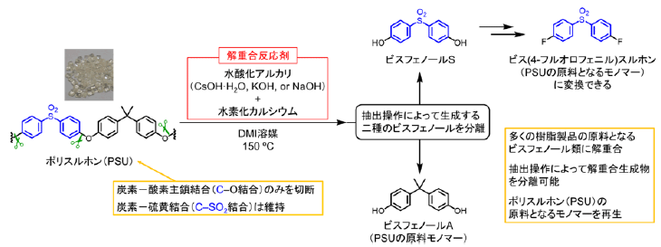 産総研はさらに塩基性解重合剤の探索を進め、2023年には、スーパーエンプラのPEEKやPSU類などを対象に、樹脂融点に比べて穏和な150℃という温度条件でケミカルリサイクルに成功した(図2、図3)。これにより、難分解性のスーパーエンプラに広く適用可能